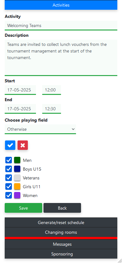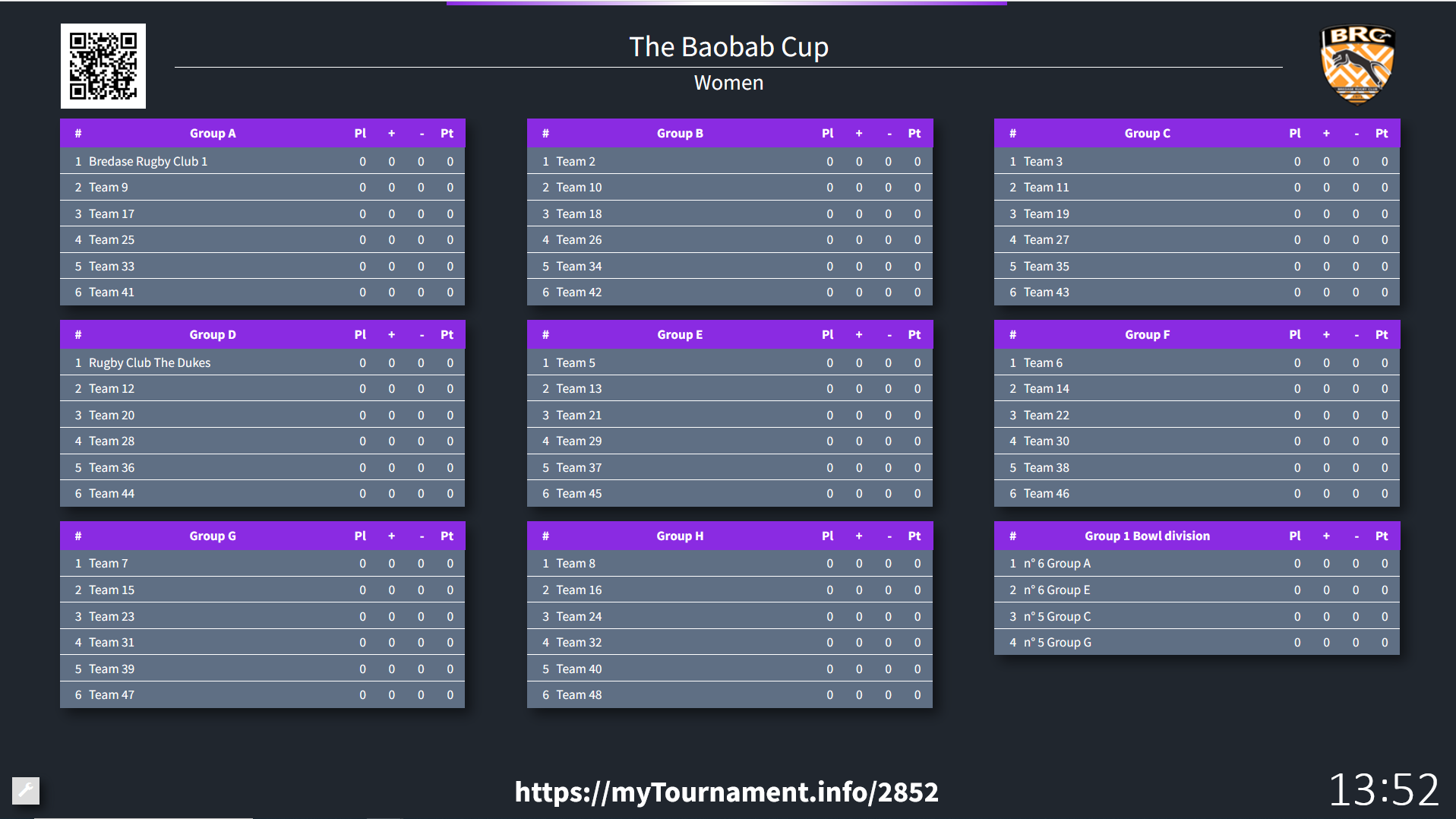 Add referees, change starting times, group composition, team names, playing fields etc.. Put up announcements on the bulletin board. All in real time!